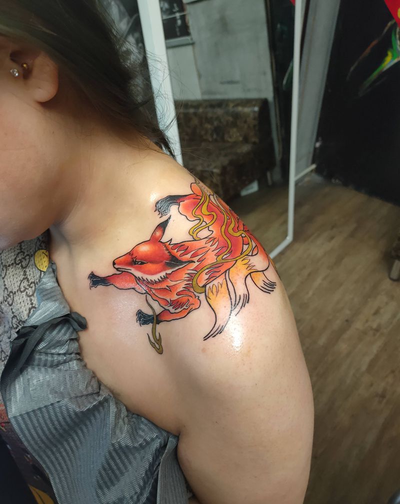 九尾狐纹身图片_肩部水彩New School纹身图案