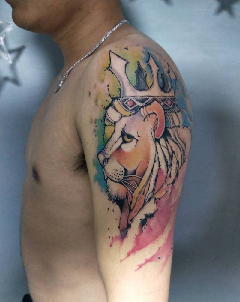 当前位置: 首页 >吉林省吉林市纹身店-牟刺青纹身图案>狮子纹身图片_手臂水墨水彩纹身图案