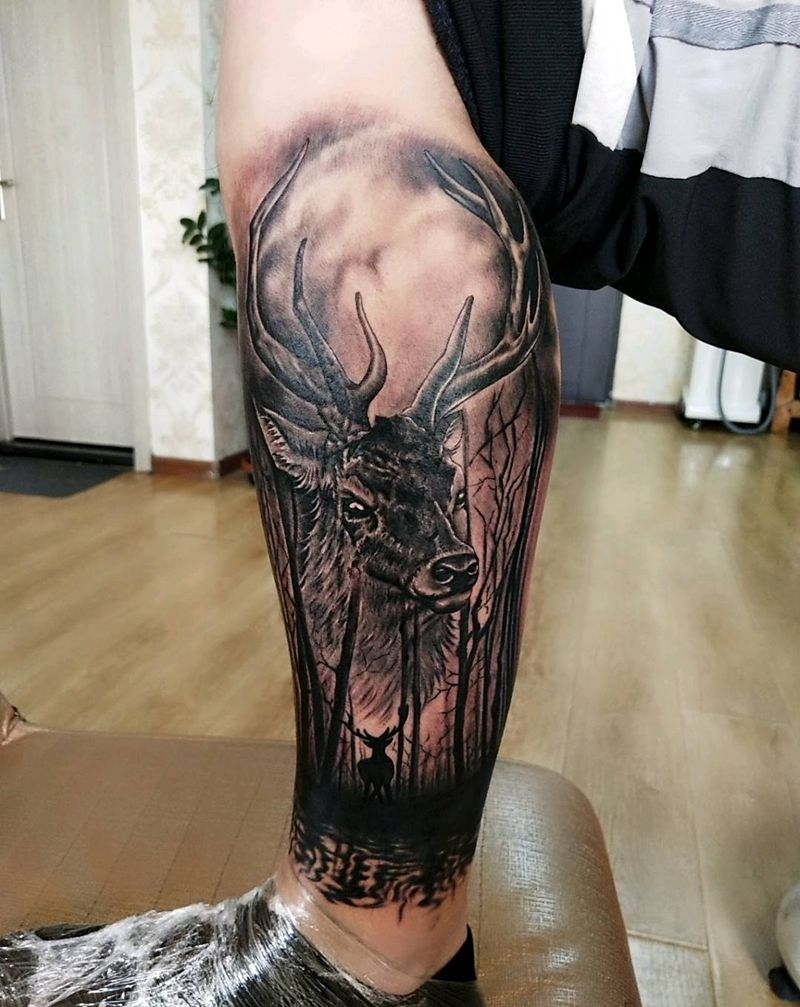 鹿纹身图片_腿部欧美写实纹身图案