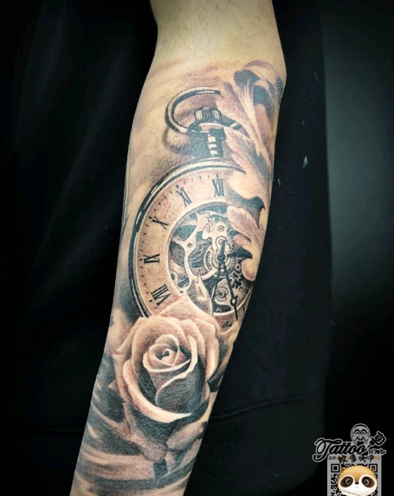 航海纹身图片_手臂欧美写实帆船怀表玫瑰纹身图案