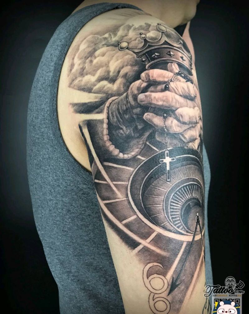 当前位置: 首页 >吉林省延边朝鲜族自治州纹身店-机械首纹身纹身图案>祈祷纹身图片_肩部手臂欧美写实手祈祷时钟纹身图案