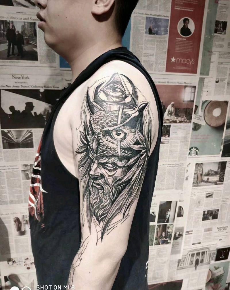 猫头鹰老人纹身图片_肩部点刺几何纹身图案