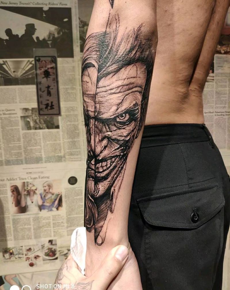 当前位置: 首页 >黑龙江省哈尔滨市纹身店-华青社中俄国际纹身纹身图案>小丑与耶稣纹身图片_手臂点刺纹身图案