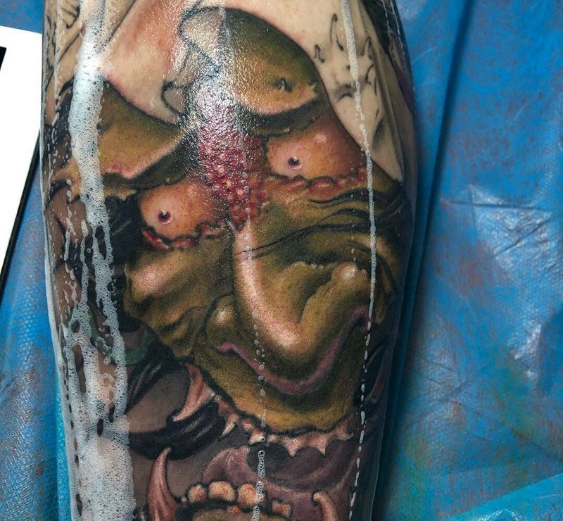 • T包小腿吹火男+阿多福纹身图片_腿部老传统新传统吹火男阿