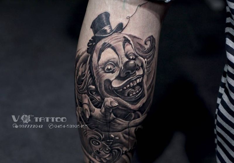• T包小腿吹火男+阿多福纹身图片_腿部老传统新传统吹火男阿