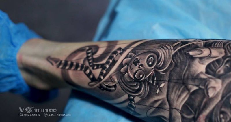 • T包小腿吹火男+阿多福纹身图片_腿部老传统新传统吹火男阿