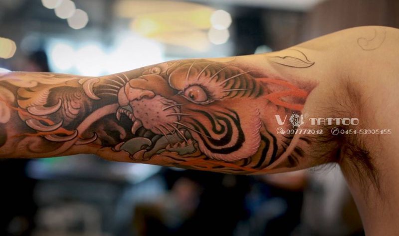 我只是一种颜色…纹身图片_成品手臂阿V作品哈尔滨V刺老虎花传统花臂纹身图案
