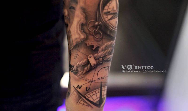 她的出现足以改变你的人生轨迹!纹身图片_手臂欧美写实指南针罗盘肖像纹身图案