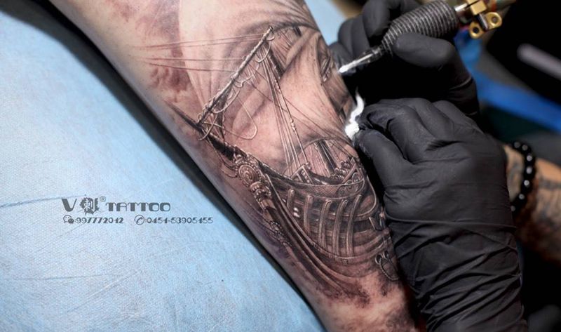 一帆风顺!by:阿V纹身图片_脚部欧美写实帆船小腿帆船哈尔滨纹身图案