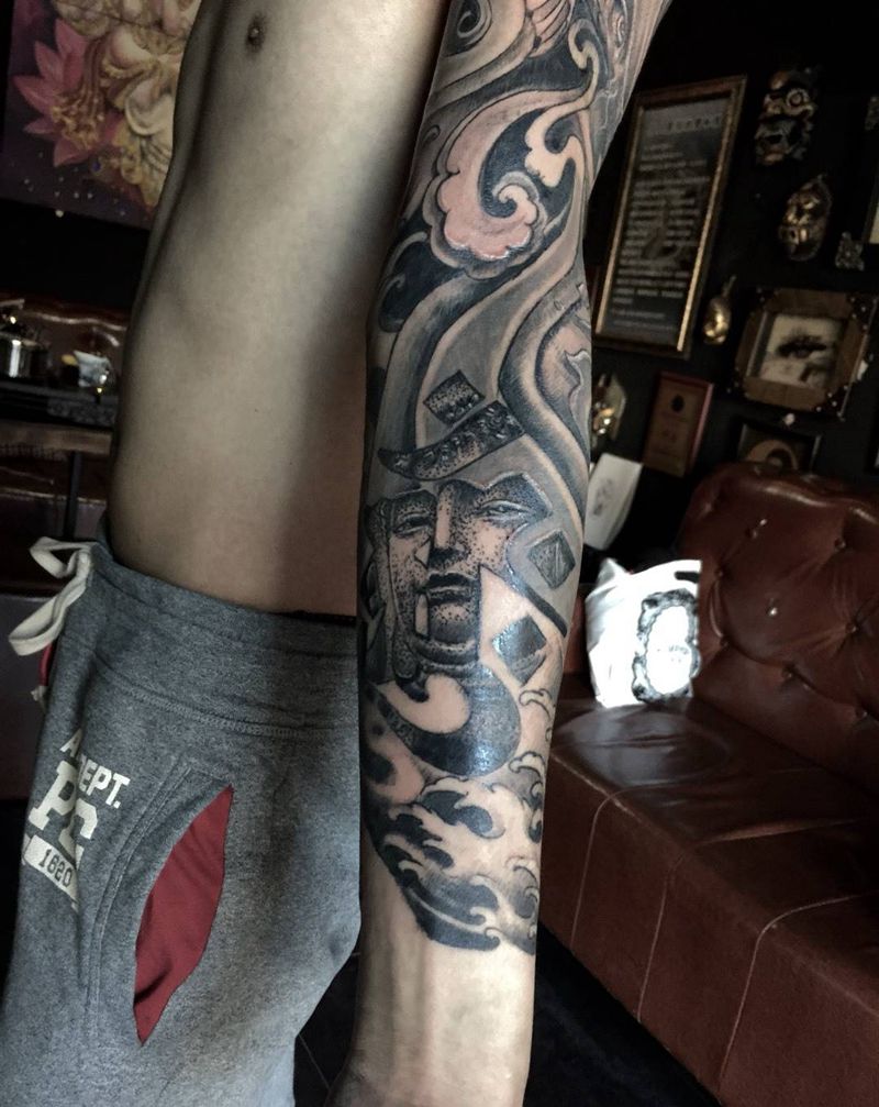 当前位置: 首页 >黑龙江省哈尔滨市纹身店-文人墨刻文身艺术俱乐部纹身图案>中国元素花臂。。。纹身图片