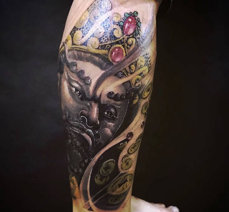 聚财天王纹身图片_腿部新传统欧美写实纹身图案