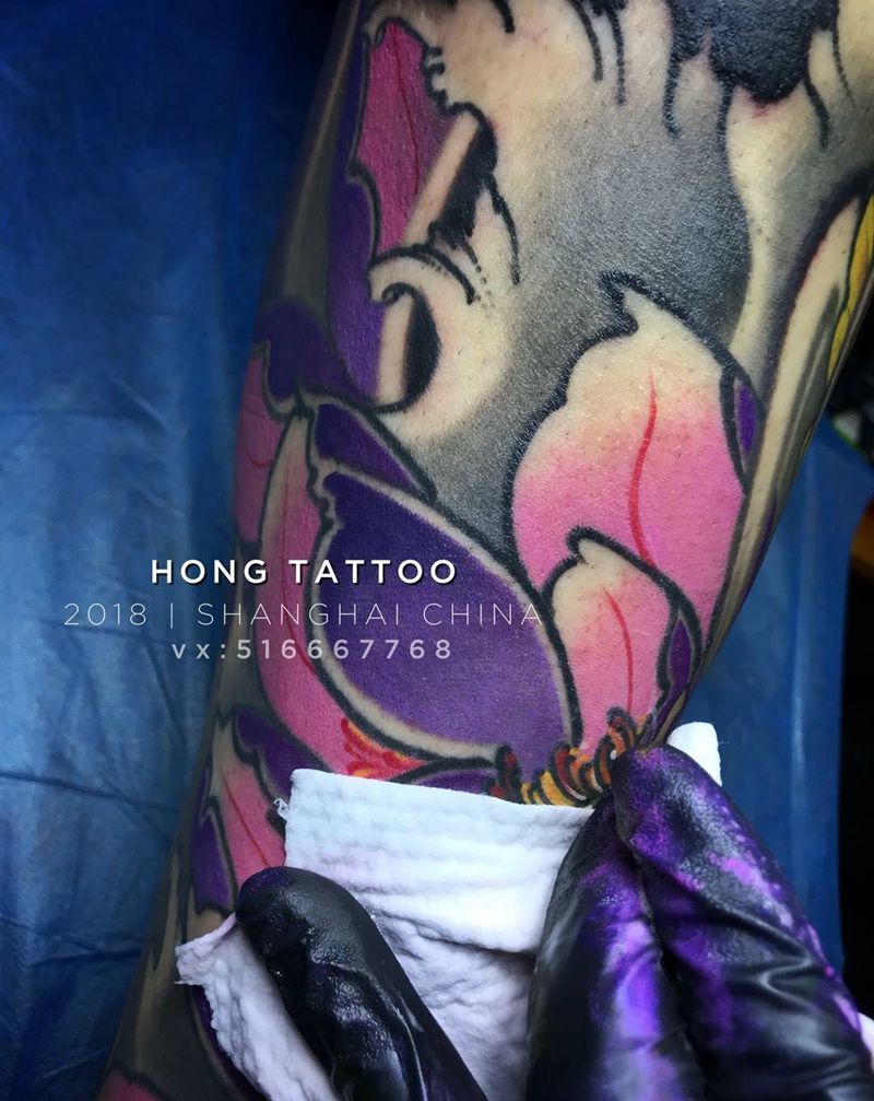 当前位置: 首页 >上海市纹身店-上海弘刺青纹身图案>鲤鱼荷花包小腿 / work:弘明纹身图片