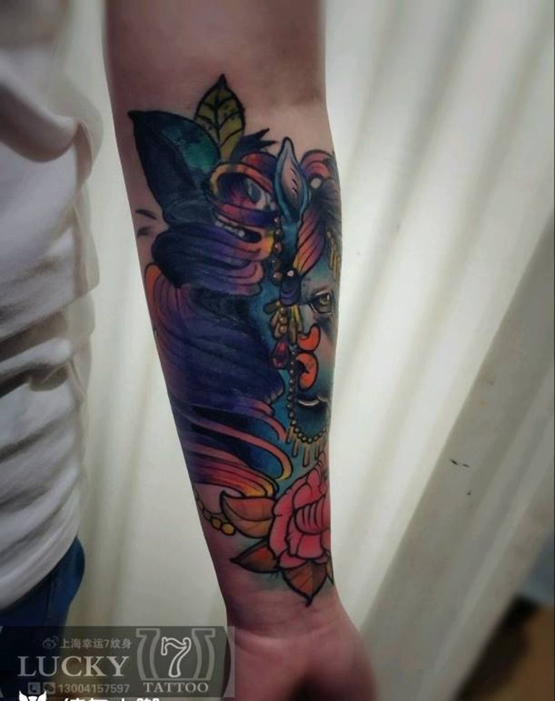 遮盖作品|马纹身|幸运7纹身纹身图片_手臂欧美动物遮盖修改彩色成品纹身图案