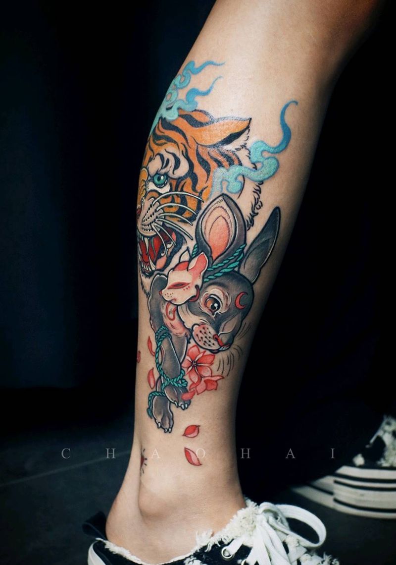 当前位置: 首页 >上海市纹身店-朝海刺青纹身图案>老虎 兔子 newschool纹身图片_腿部New School老虎兔子newschool纹身图案
