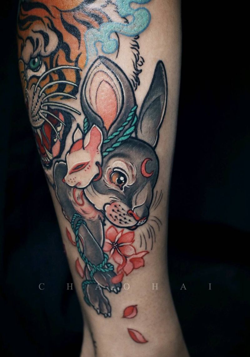 当前位置: 首页 >上海市纹身店-朝海刺青纹身图案>老虎 兔子 newschool纹身图片_腿部New School老虎兔子newschool纹身图案