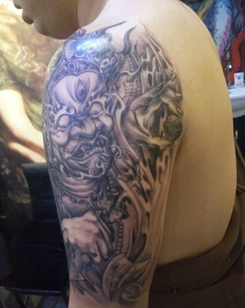 当前位置: 首页 >上海市纹身店-臻簪刺青纹身图案>大黑天纹身图片_手臂传统人物鬼神成品纹身图案