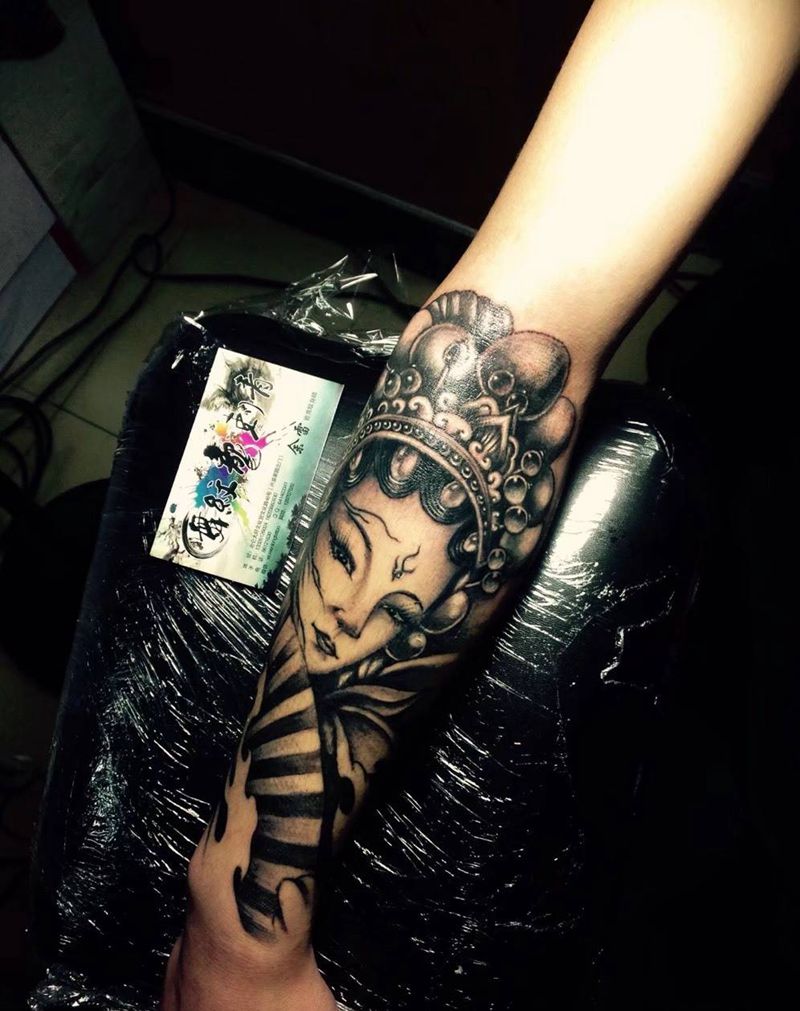 当前位置: 首页 >上海市纹身店-自由刺青纹身图案>花旦纹身图片_成品手臂传统人物纹身图案