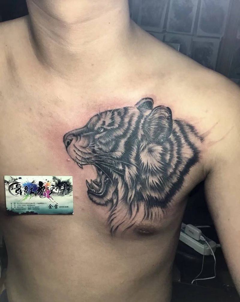 虎纹身图片_胸部欧美写实纹身图案
