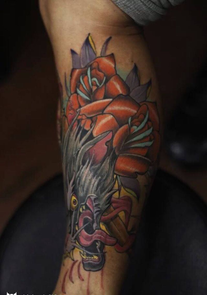 • T网红王老大花腿龙纹身图片_腿部新传统纹身图案