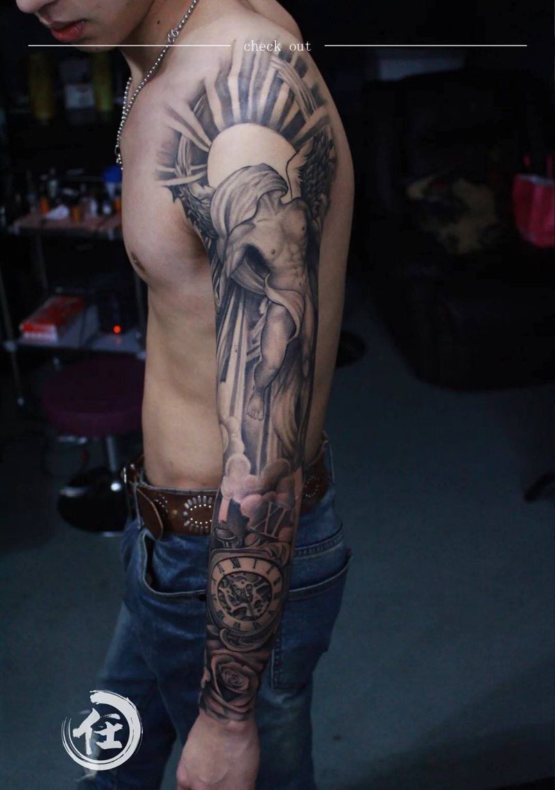 当前位置: 首页 >上海市纹身店-上海任刺青纹身工作室纹身图案>花臂男神纹身图片_欧美肖像人物鬼神写实成品肩部手臂手部静物纹身图案