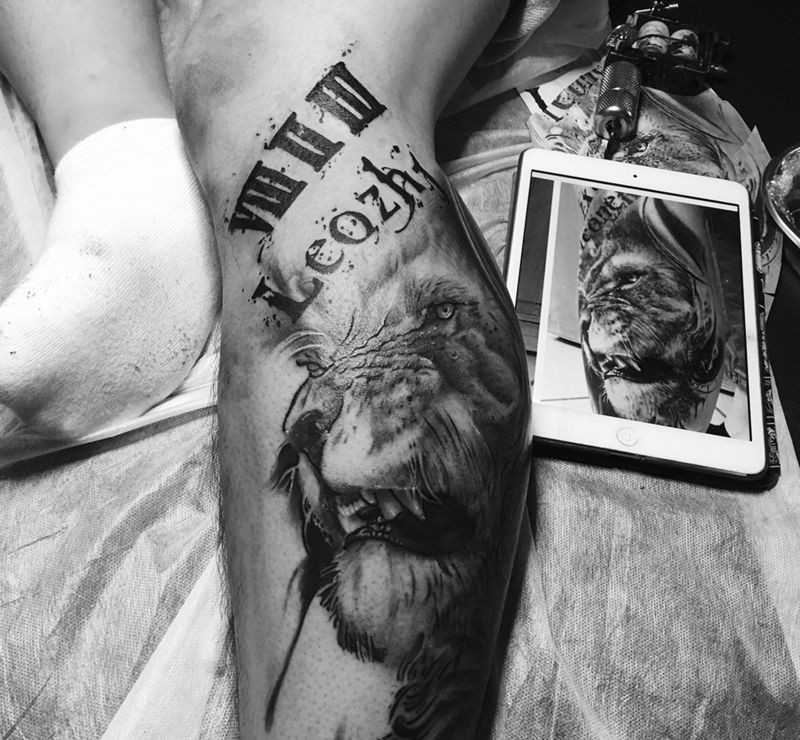 当前位置: 首页 >上海市纹身店-上海任刺青纹身工作室纹身图案>写实狮子纹身图片_成品腿部写实原创纹身图案