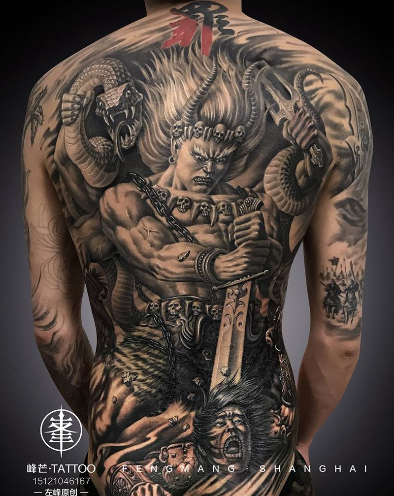 蚩尤神怒(原创)纹身图片_背部新传统欧美写实蚩尤战神猛将纹身图案