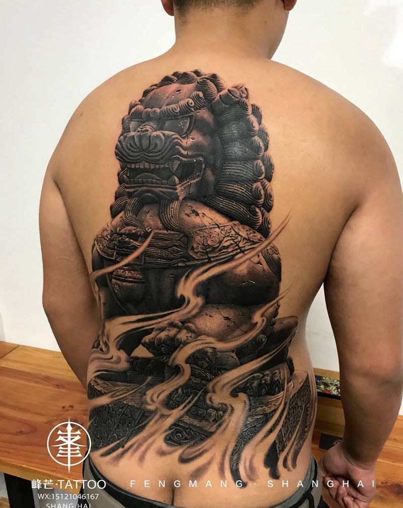 当前位置: 首页 >上海市纹身店-峰芒刺青纹身图案>狮佑中华纹身图片_背部欧美写实新传统雕刻石雕唐狮纹身图案
