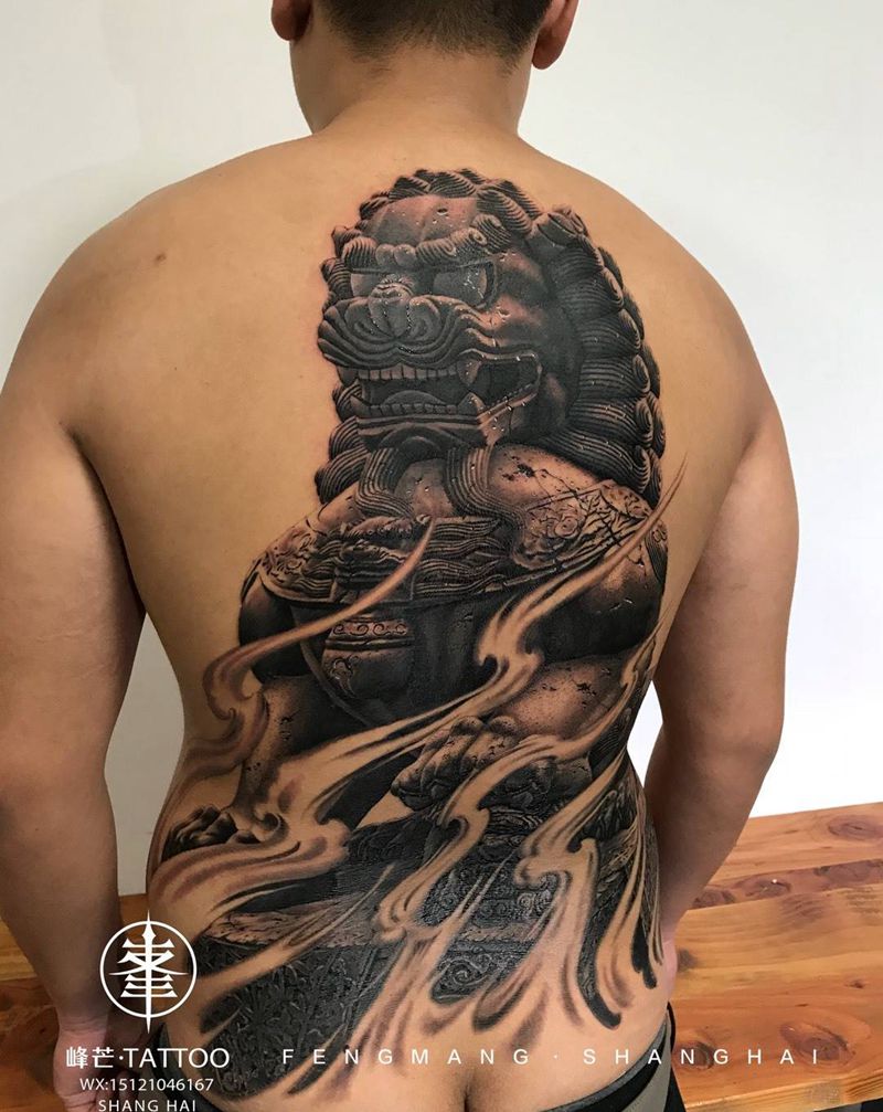 当前位置: 首页 >上海市纹身店-峰芒刺青纹身图案>狮佑中华纹身图片_背部欧美写实新传统雕刻石雕唐狮纹身图案