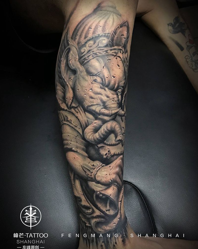 当前位置: 首页 >上海市纹身店-峰芒刺青纹身图案>象神石雕改造(原创)纹身图片_腿部背部新传统欧美写实象神石雕原创纹身图案
