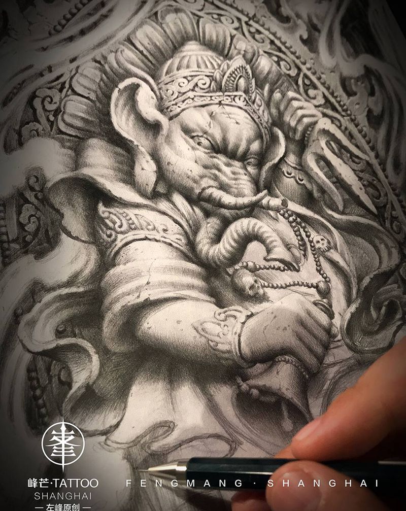 当前位置: 首页 >上海市纹身店-峰芒刺青纹身图案>象神石雕改造(原创)纹身图片_腿部背部新传统欧美写实象神石雕原创纹身图案