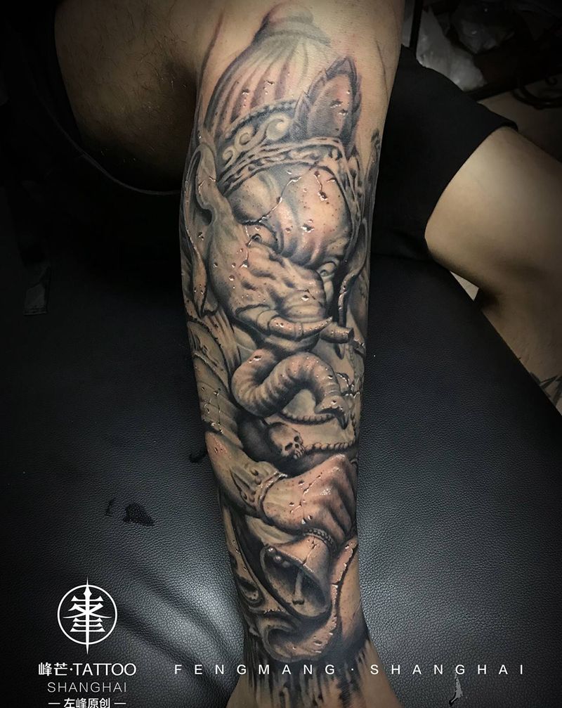 当前位置: 首页 >上海市纹身店-峰芒刺青纹身图案>象神石雕改造(原创)纹身图片_腿部背部新传统欧美写实象神石雕原创纹身图案