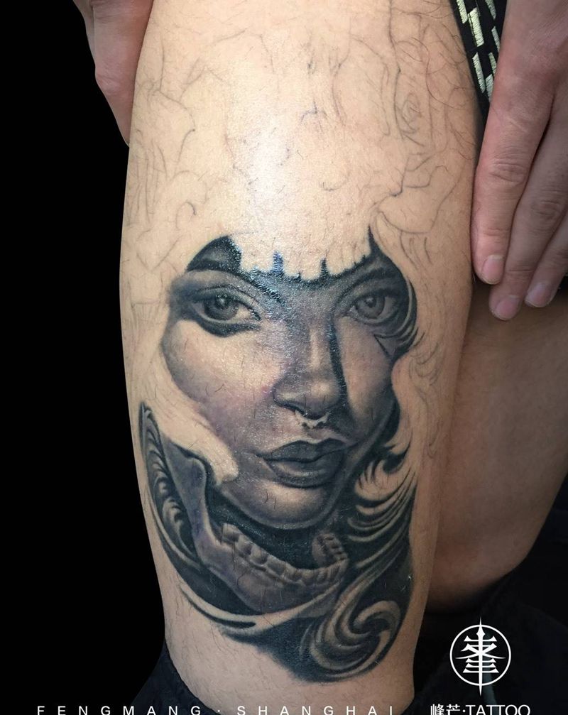 当前位置: 首页 >上海市纹身店-峰芒刺青纹身图案>写实美女肖像纹身图片_腿部手臂欧美写实New School美女肖像骷髅纹身图案