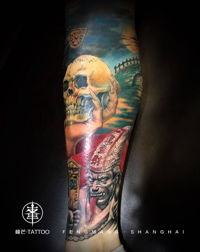 当前位置: 首页 >上海市纹身店-峰芒刺青纹身图案>钟馗伏魔(原创)纹身图片_腿部新传统欧美写实钟馗原创无常纹身图案