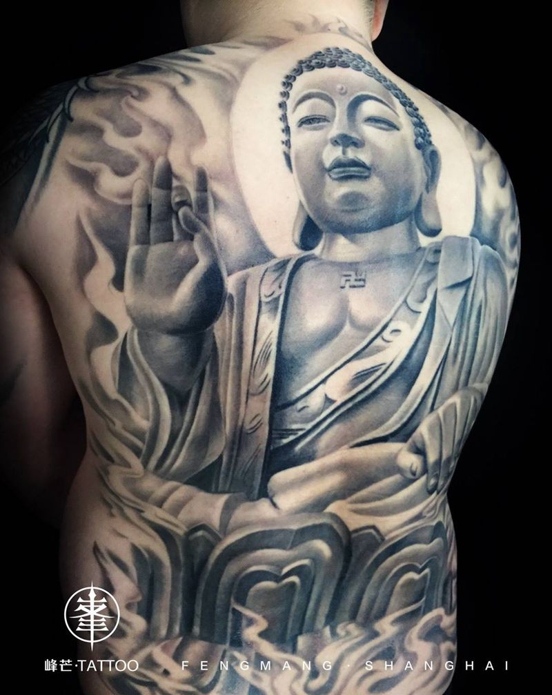 当前位置: 首页 >上海市纹身店-峰芒刺青纹身图案>大日如来(原创)纹身图片_背部欧美写实新传统如来佛雕塑纹身图案