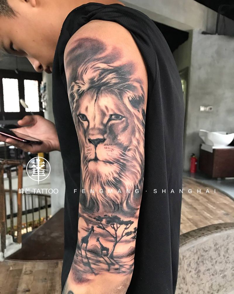 非洲梦(原创)纹身图片_手臂肩部欧美写实狮子原创动物纹身图案