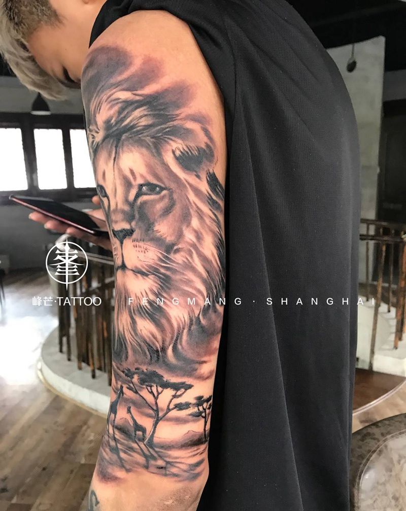 当前位置: 首页 >上海市纹身店-峰芒刺青纹身图案>非洲梦(原创)纹身图片_手臂肩部欧美写实狮子原创动物纹身图案