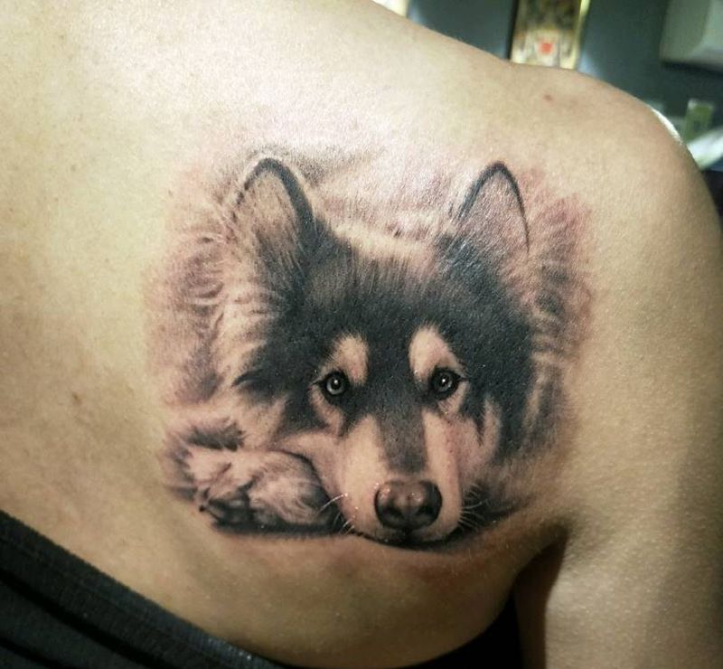 宠物纹身图片_肩部欧美写实新传统纹身图案