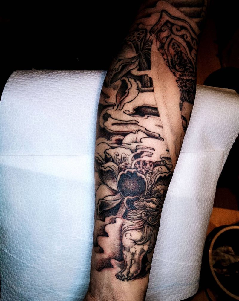 当前位置: 首页 >江苏省南京市纹身店-南京纹身叁鱼刺客工作室纹身图案>花臂拼接纹身图片_手臂点刺新传统遮盖唐狮菩萨纹身图案