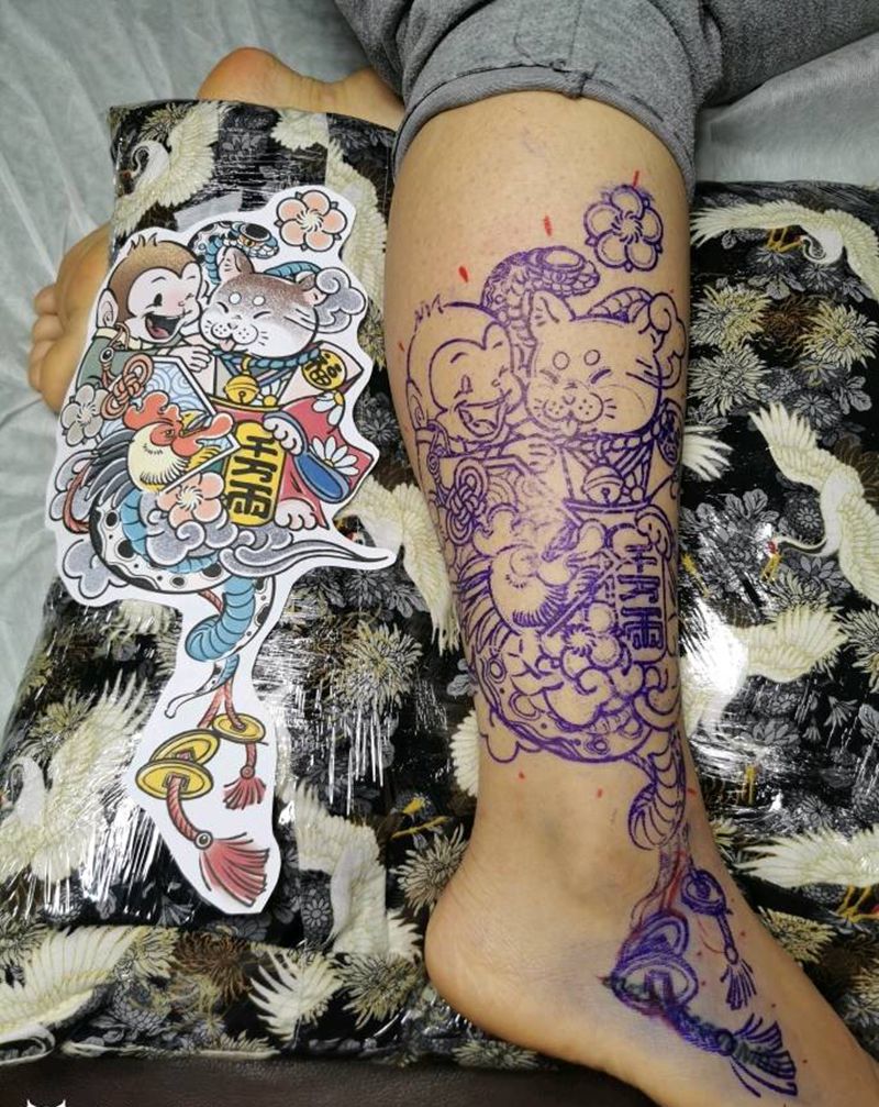 当前位置: 首页 >江苏省无锡市纹身店-青臣刺青纹身tattoo纹身图案>全家生肖纹身图片_腿部New School老传统生肖卡通女性纹身图案