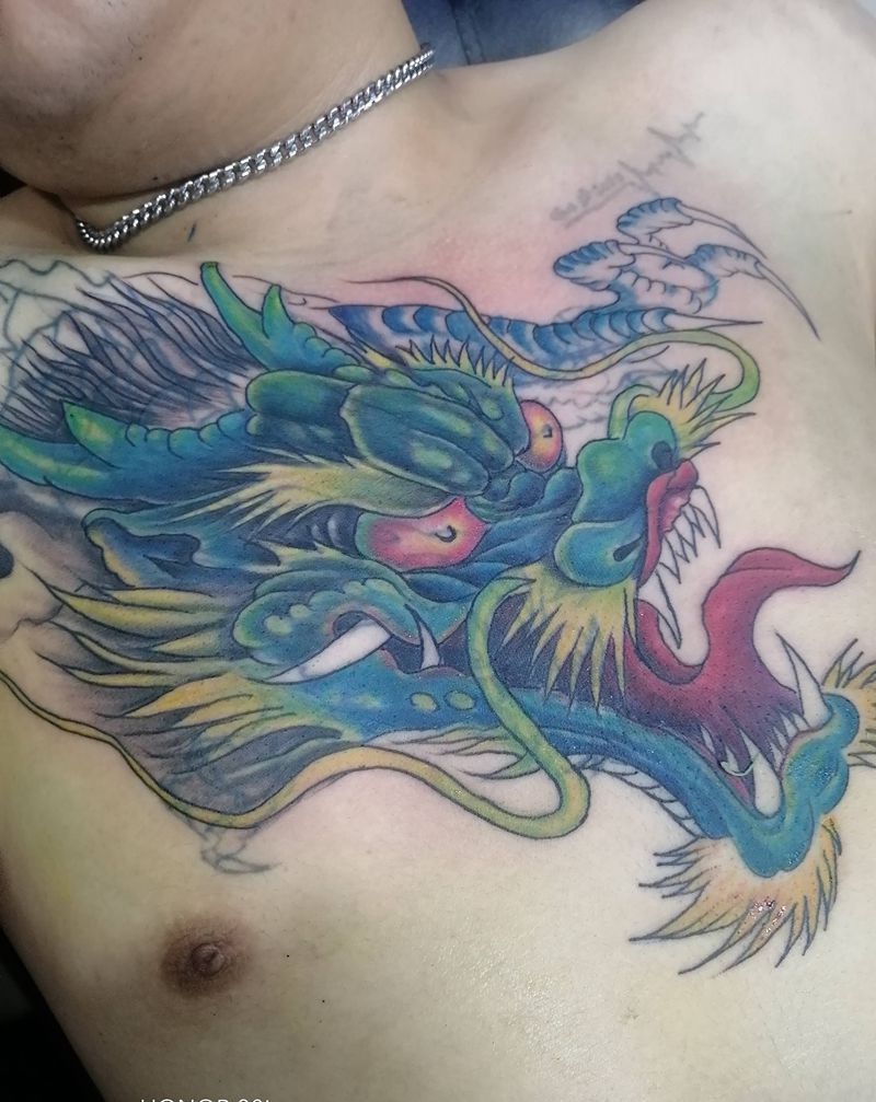 遮盖老龙头纹身图片_胸部老传统纹身图案