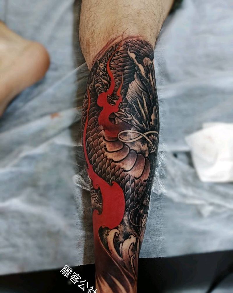 • T网红王老大花腿龙纹身图片_腿部新传统纹身图案