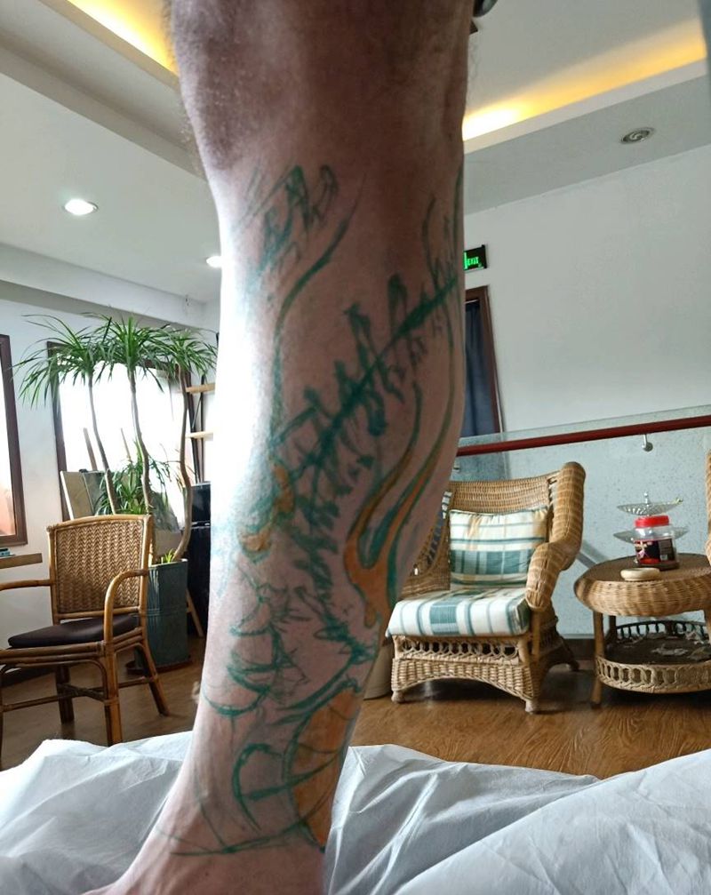 • T网红王老大花腿龙纹身图片_腿部新传统纹身图案