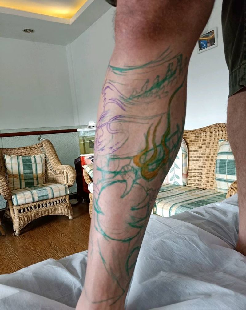 • T网红王老大花腿龙纹身图片_腿部新传统纹身图案