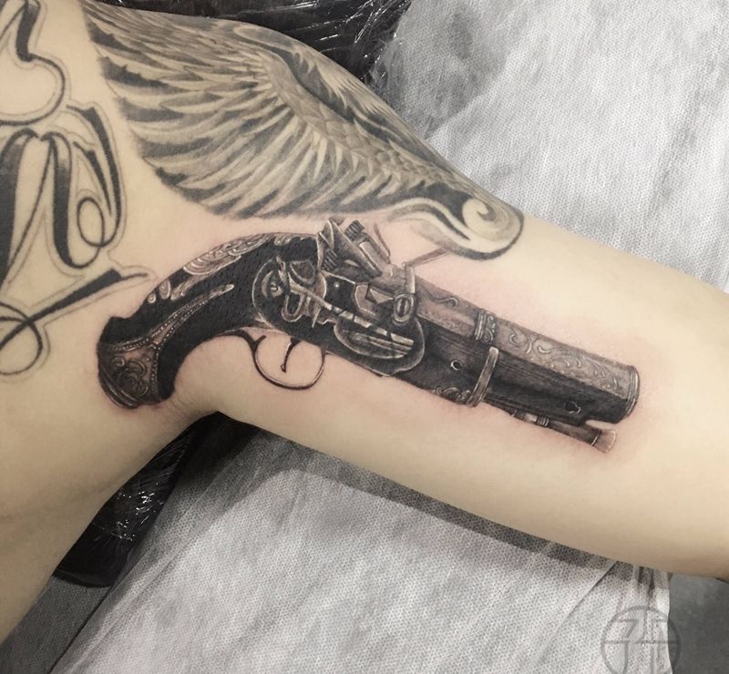 当前位置: 首页 >江苏省徐州市纹身店-山奈刺青纹身图案>枪(遮盖)纹身图片_手臂欧美写实纹身图案