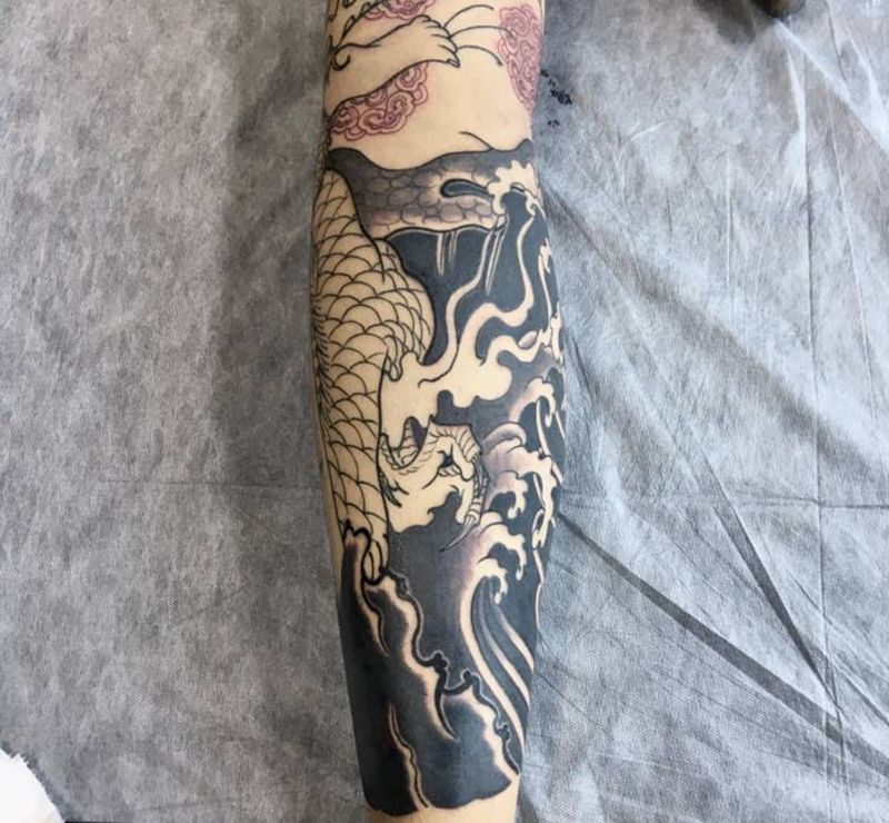 • T网红王老大花腿龙纹身图片_腿部新传统纹身图案