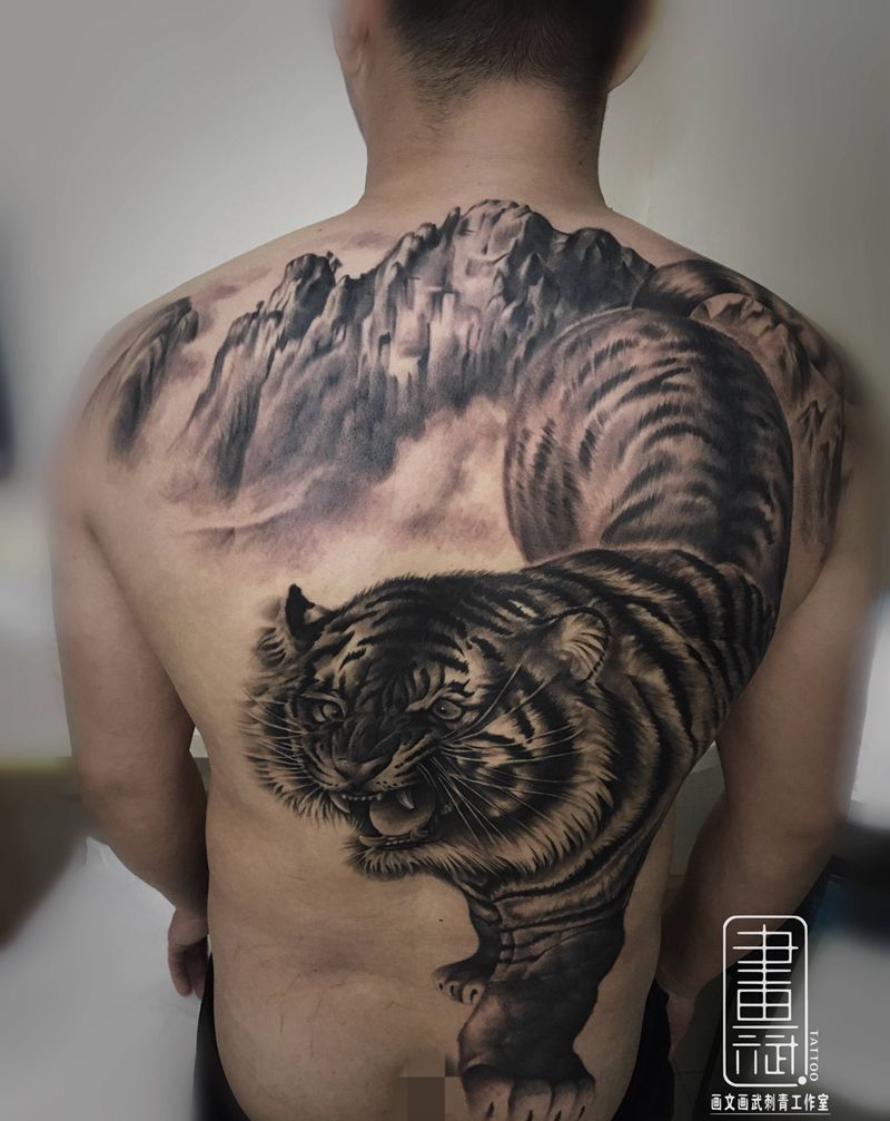 当前位置: 首页 >江苏省徐州市纹身店-徐州画文画武刺青工作室纹身图案>雄风震山川纹身图片_背部欧美写实老虎下山虎山纹身图案