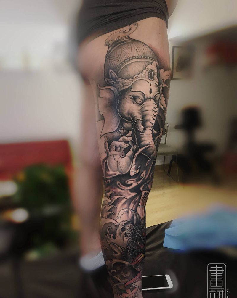当前位置: 首页 >江苏省徐州市纹身店-徐州画文画武刺青工作室纹身图案>花腿修改纹身图片_腿部新传统象神花腿修改花腿纹身图案