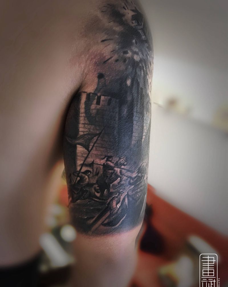 当前位置: 首页 >江苏省徐州市纹身店-徐州画文画武刺青工作室纹身图案>遮盖纹身图片_肩部手臂欧美写实遮盖战场包大臂纹身图案