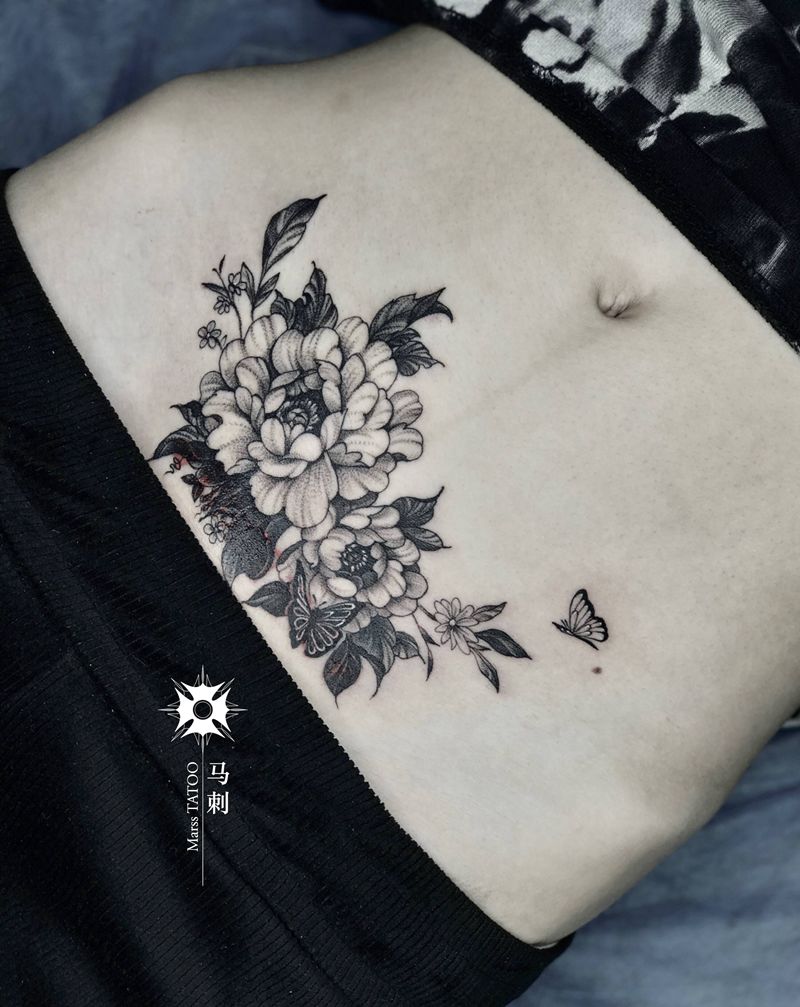 遮盖作品~素花纹身图片_腹部点刺纹身图案