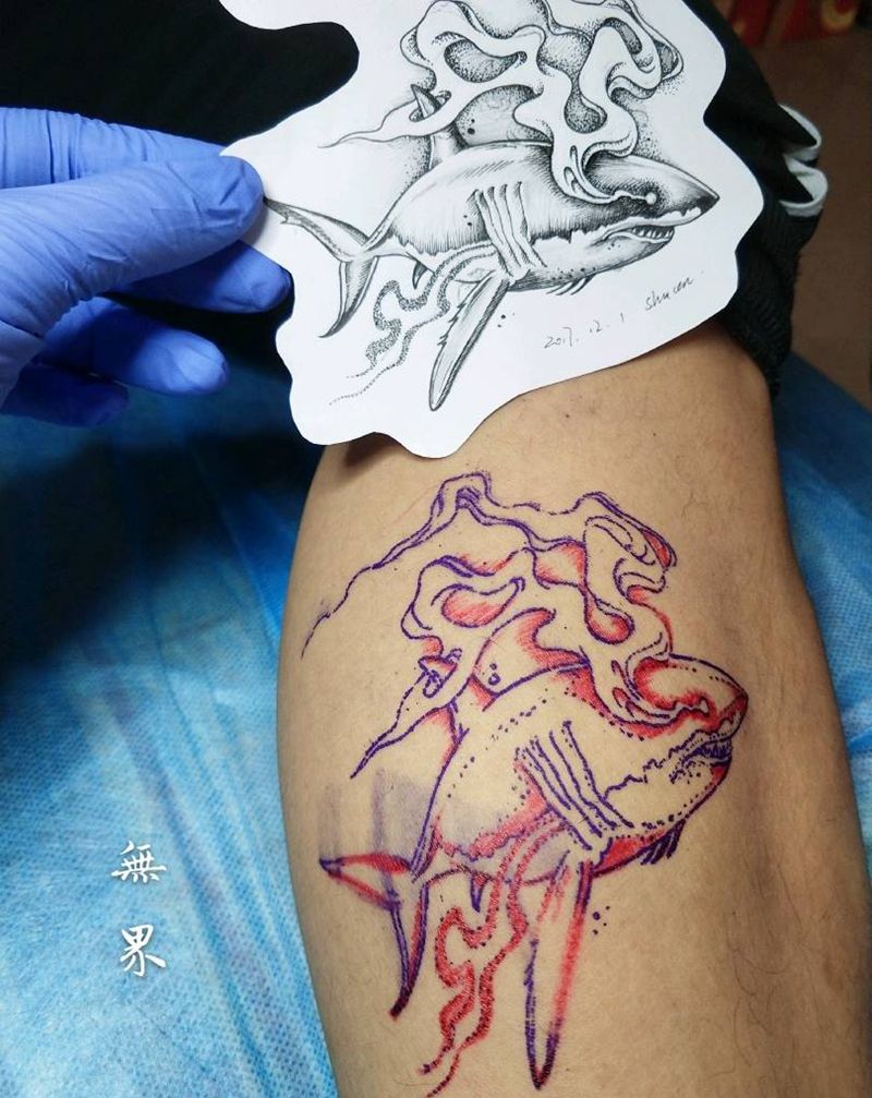 当前位置: 首页 >江苏省徐州市纹身店-徐州无界纹身纹身图案>暗黑系小鲨鱼纹身图片_腿部欧美原创鲨鱼暗黑成品纹身图案